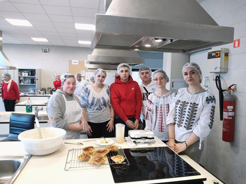 10 leerlingen en 3 leerkrachten uit Slobozia Roemenië waren een week te gast op onze school. Ze bezochten verschillende lessen, ze leerden Belgische wafels bakken, kregen uitleg over het Belgisch democratisch systeem, kregen Nederlandse les, en bezochten een kinderdagverblijf. De Roemeense leerlingen gaven uitleg over Roemenië, ze waren zelfs gekleed in traditionele klederdracht. kortom het was een zeer leerrijke week zowel voor onze leerlingen als voor de leerlingen uit Roemenië.