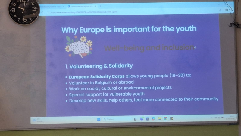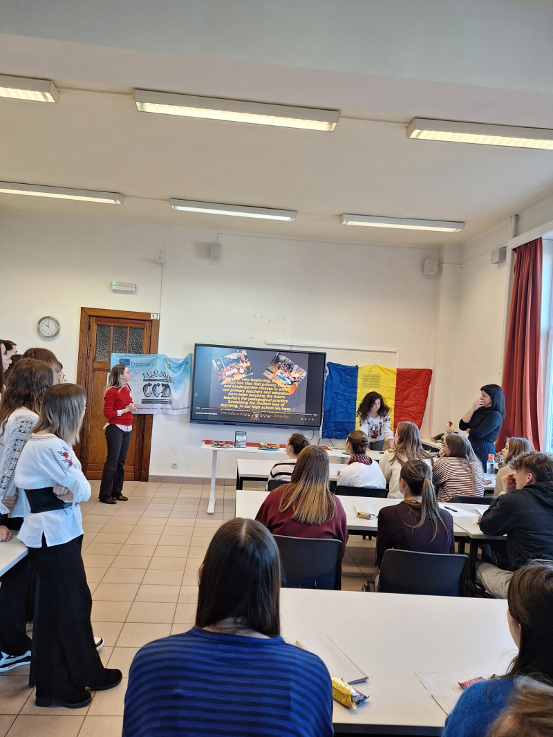 10 leerlingen en 3 leerkrachten uit Slobozia Roemenië waren een week te gast op onze school. Ze bezochten verschillende lessen, ze leerden Belgische wafels bakken, kregen uitleg over het Belgisch democratisch systeem, kregen Nederlandse les, en bezochten een kinderdagverblijf. De Roemeense leerlingen gaven uitleg over Roemenië, ze waren zelfs gekleed in traditionele klederdracht. kortom het was een zeer leerrijke week zowel voor onze leerlingen als voor de leerlingen uit Roemenië.
